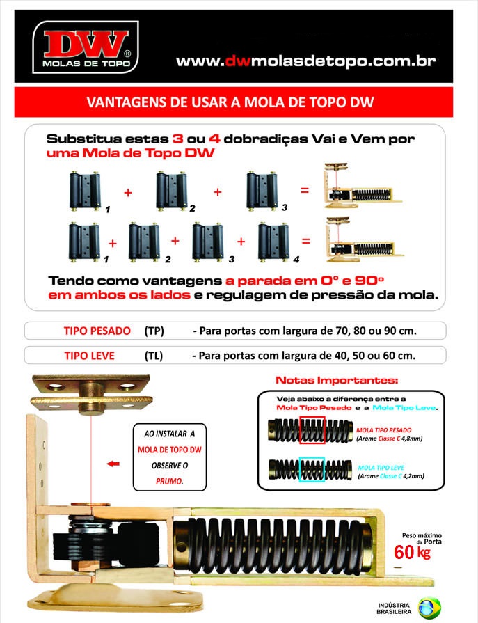 5. Como a sustentação do peso da porta fica sobre a mola, e a porta faz o seu giro preso a um conjunto de pivôs, não existe a possibilidade da porta pender para baixo.